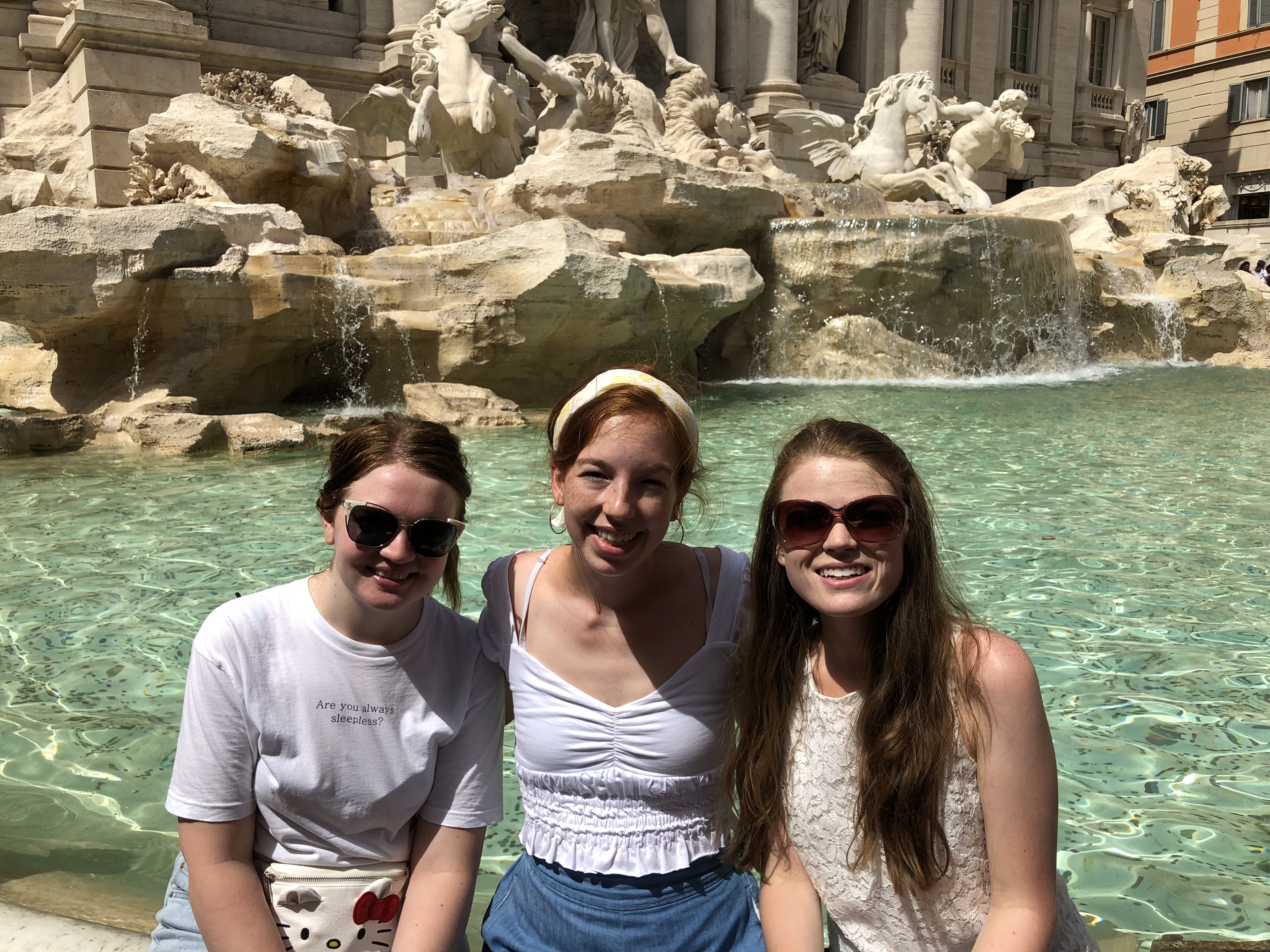 The next day, our last day in Rome, was off to a bumpy start. Our stomachs hurt from our first vegan meal in Italy, and we were sleep deprived from travel. Only three of the four of us made it to Saint Peter’s Basilica. Luckily we only had to wait for about 15 minutes in line to get in, but we did get rained on. We had Bernini’s colonnade wrapping its arms around us, keeping us safe. To me, Saint Peter’s Basilica was a special and emotional experience. This was the second Pieta of Michelangelo’s that I had seen on this trip, and I was sad to see that this Pieta, the one that Michelangelo had wanted the world to see, was now displayed at a safe distance from the public, and behind bullet proof glass. The idea that someone would attack this piece filled me with sadness. The concept of Michelangelo’s struggle and journey with the Pieta reminded me of the hardships of being an artist. Knowing that I am not alone in my perfectionism and struggle to improve as an artist is reassuring and sometimes emotionally overwhelming. After Saint Peter’s we headed to the other side of the river, and strolled along the Colosseum, the Forum, and “The Wedding Cake”. Because the metro stops close to the Trevi Fountain and San Maria della Vittoria were closed, we did a lot of walking throughout Rome. Yes, Rome is walkable, but just because you can see your walking destination in the distance does not mean it is close.