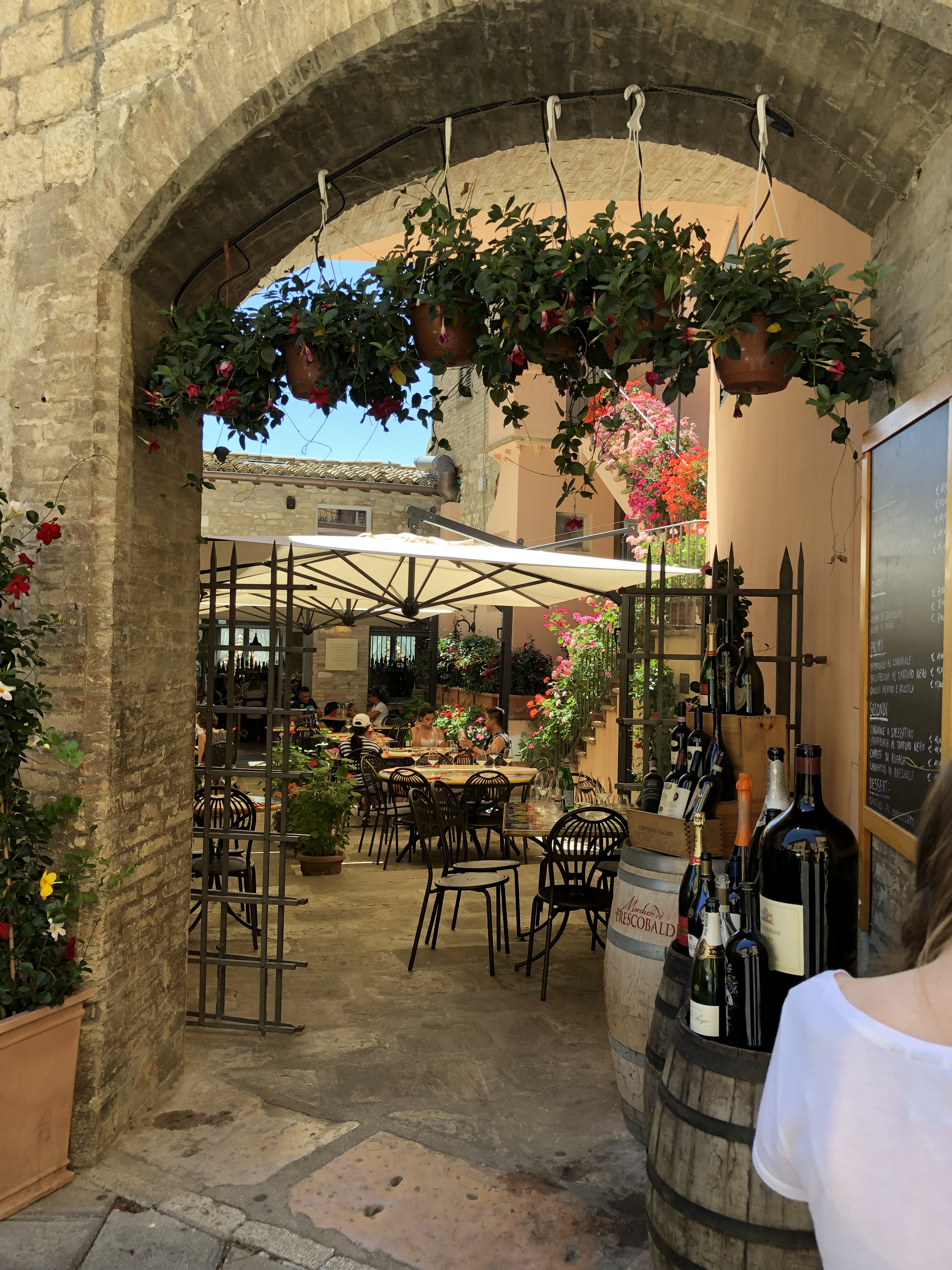 We finished our day in Assisi with lunch in a little outside garden of a restaurant that specializes in wine and olive oil. I messed up when ordering my wine. It’s not my fault that this is the only restaurant that had Amarone or Barolo I have found on the whole trip, even though we were in Umbria. The waitress pressured me into ordering an Umbrian wine, which was still very good. Also, I didn’t realize only one person at the table tastes the wine before it is served, oops! Mi dispiace. After lunch we strolled through the Temple of Minerva, a Roman Temple turned Baroque house of the Lord, and then saw the Roman Forum and walked along the streets of Assisi from the days of the Roman Empire. The street level of Assisi used to be a lot lower, but I am sure the hills were just as steep.